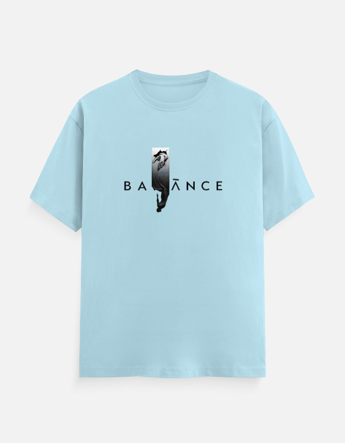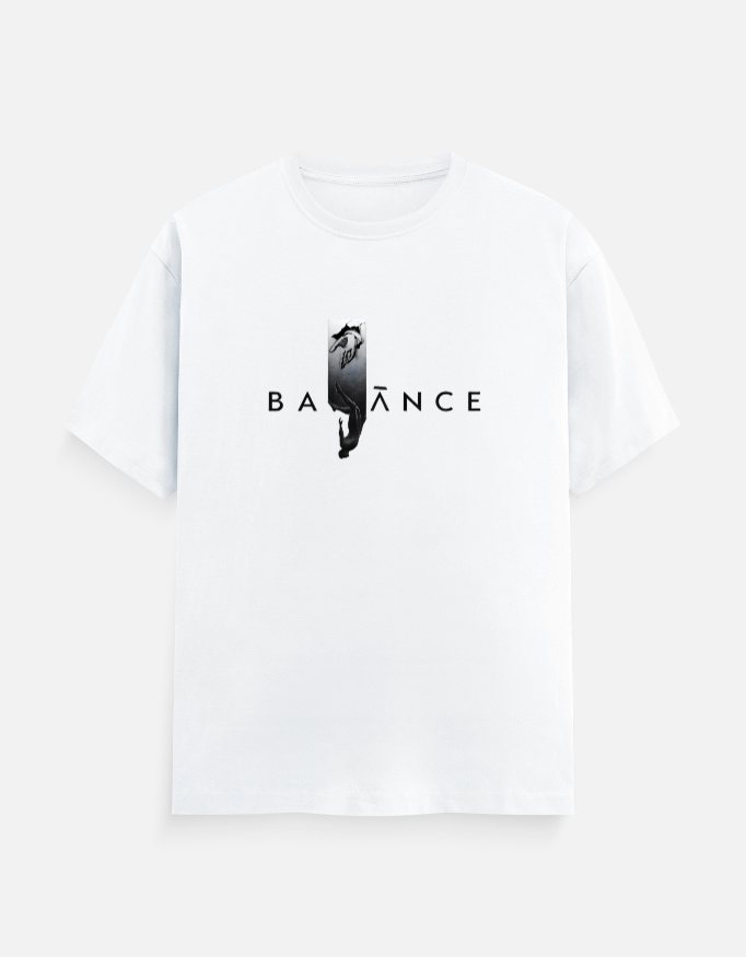 This exclusive design features a bold typographic layout of the word “BALANCE,” creatively integrated with a falling human figure and an outstretched hand – symbolizing both chaos and control, struggle and support—a wearable conversation starter.