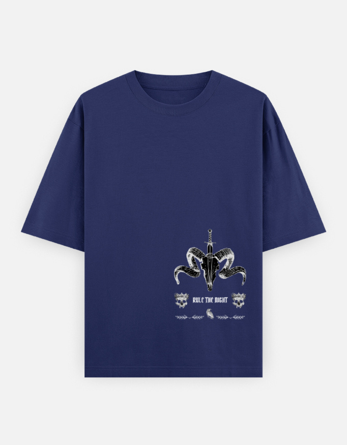 Channel power, rebellion, and dark royalty with this Oversized Royal Blue Classic T-shirt, featuring an exclusive gothic ram skull and sword graphic printed in high-definition DTF (Direct to Film) style. The hauntingly detailed design includes crowned skulls and the battle cry: “Rule The Night,” – making it a must-have for those who lead with quiet strength and mystery.